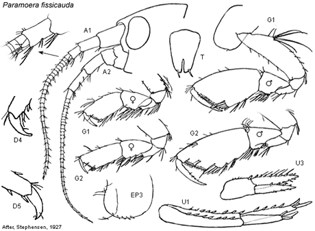 Paramoera fissicauda (Dana) Description. Head rostrum present, short; eyes present, eyes reniform. Body dorsally smooth. Antenna 1 shorter than antenna 2; accessory flagellum present, accessory flagellum minute. Maxilla 1 inner plate setose along medial margin. Peraeon. Gnathopod 1 subchelate; smaller than gnathopod 2; coxa weakly or not produced anteroventrally; carpus not cantilevered, shorter than propodus, without a lobe; propodus without robust setae along posterior margin (adults); dactylus narrowing distally, apically acute or subacute. Gnathopod 2 not sexually dimorphic. Gnathopod 2 subchelate; carpus not cantilevered, without a lobe, shorter than propodus; propodus without robust setae along posterior margin (adults); dactylus narrowing distally, apically acute or subacute. Peraeopods 3-4 propodus simple, with distal robust setae. Peraeopods 5-7 dactyli inner margins smooth or minutely castellate. Pleon. Pleonites neither tricarinate. Epimeron 3 posteroventral margin smooth, corner broadly rounded. Uropod 1 outer ramus shorter than inner. Uropod 3 peduncle with dorsal robust setae; rami subequal in length. Telson cleft, with large apical robust setae. Remarks. There is an old record in AM collection from Port Jackson.