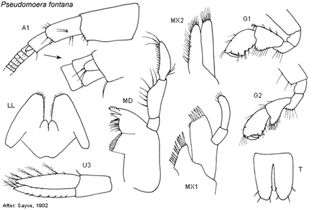 Pseudomoera fontana (Sayce) Atyloides fontana Sayce, 1902: 49, pl. 5. --Stebbing, 1909: 729. --Stebbing, 1910: 640. Pseudomoera fontana. --Bradbury & Williams, 1999: 12 (key), 19. Type material. Probably lost. Type locality. Rivulet (about 1000 m altitude) near Wood's Point, Victoria. Description. Based on Sayce, 1902: 49, pl. 5. Head rostrum present, short; eyes present, eyes round. Body dorsally smooth. Antenna 1 longer than antenna 2, or subequal in length to antenna 2; accessory flagellum present, accessory flagellum minute. Mandible molar columnar, triturative. Lower lip inner lobes present; outer lobes with narrow gap. Maxilla 1 inner plate setose along medial margin. Maxilla 2 inner plate subequal or slightly broader than outer; inner plate with slender medial setae, with oblique row of slender setae. Peraeon. Gnathopod 1 subchelate; subequal to gnathopod 2; coxa weakly or not produced anteroventrally; carpus not cantilevered, subequal in length to propodus, posterodistally lobed; propodus without robust setae along posterior margin (adults); dactylus narrowing distally, apically acute or subacute. Gnathopod 2 not sexually dimorphic. Gnathopod 2 subchelate; carpus not cantilevered, posterodistally lobed, subequal in length to propodus; propodus without robust setae along posterior margin (adults); dactylus narrowing distally, apically acute or subacute. Peraeopods 3-4 propodus simple. Pleon. Pleonites neither tricarinate. Epimeron 3 posteroventral margin smooth, corner acutely produced. Uropod 1 outer ramus shorter than inner. Uropod 3 peduncle with dorsal robust setae; rami subequal in length. Telson cleft, with large apical robust setae. Habitat. Freshwater; streams. Altitude. 1000 m. Distribution. Victoria: rivulet near Wood's Point, Murray-Darling basin (Sayce, 1902). Geographic areas. South-eastern Australia.